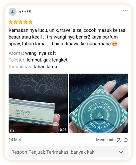 Parfum kami diformulasikan dengan bahan berkualitas tinggi dan telah diuji dermatologis. Namun, bagi kulit sangat sensitif, disarankan tes terlebih dahulu di area kecil atau konsultasikan kepada dokter.