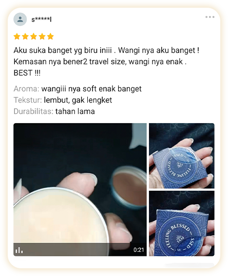 Parfum padat yang terbuat dari campuran bahan-bahan alami seperti beeswax hingga essential oil, serta diperkaya dengan vitamin E sehingga aman di kulit dan terasa lembut ketika dipakai.